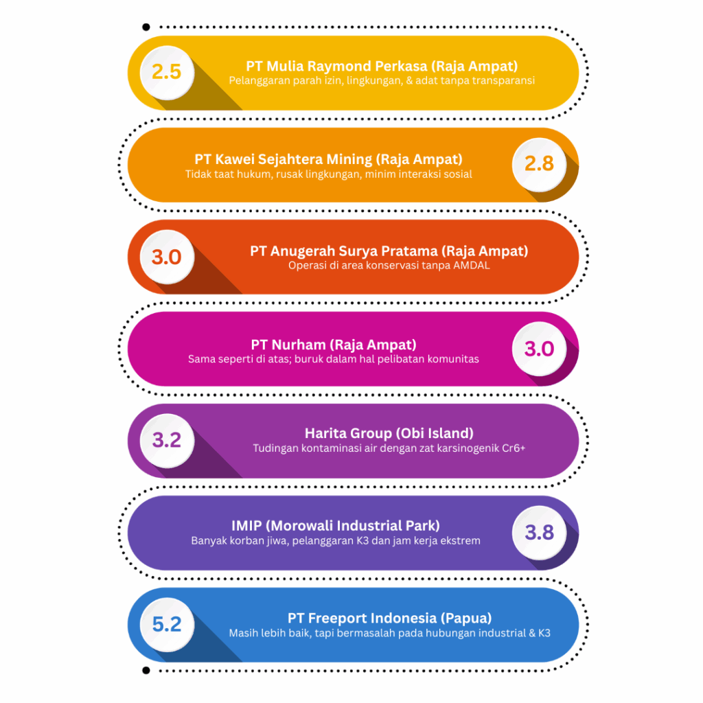 Skoring tanggung jawab sosial (TJSL) perusahaan tambang yang bermasalah, menggunakan skala 1–10 (1 = sangat buruk, 10 = sangat baik):